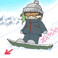 午前中練習した結果なんとか正面向いて降りる事はできました。ブレーキかけながらずり落ちてる感じですが(笑)。スーッと滑って回転して後ろ向きで(つま先で)止まるのまではできませんでした。もう身体が限界で無理でしたよ・・・。リフトも4回乗りましたが(リフト降りるのはすぐできたv)、最後まであの片足ボードつけたまま移動が上手くできなかったです。アレは股関節に来る・・・。